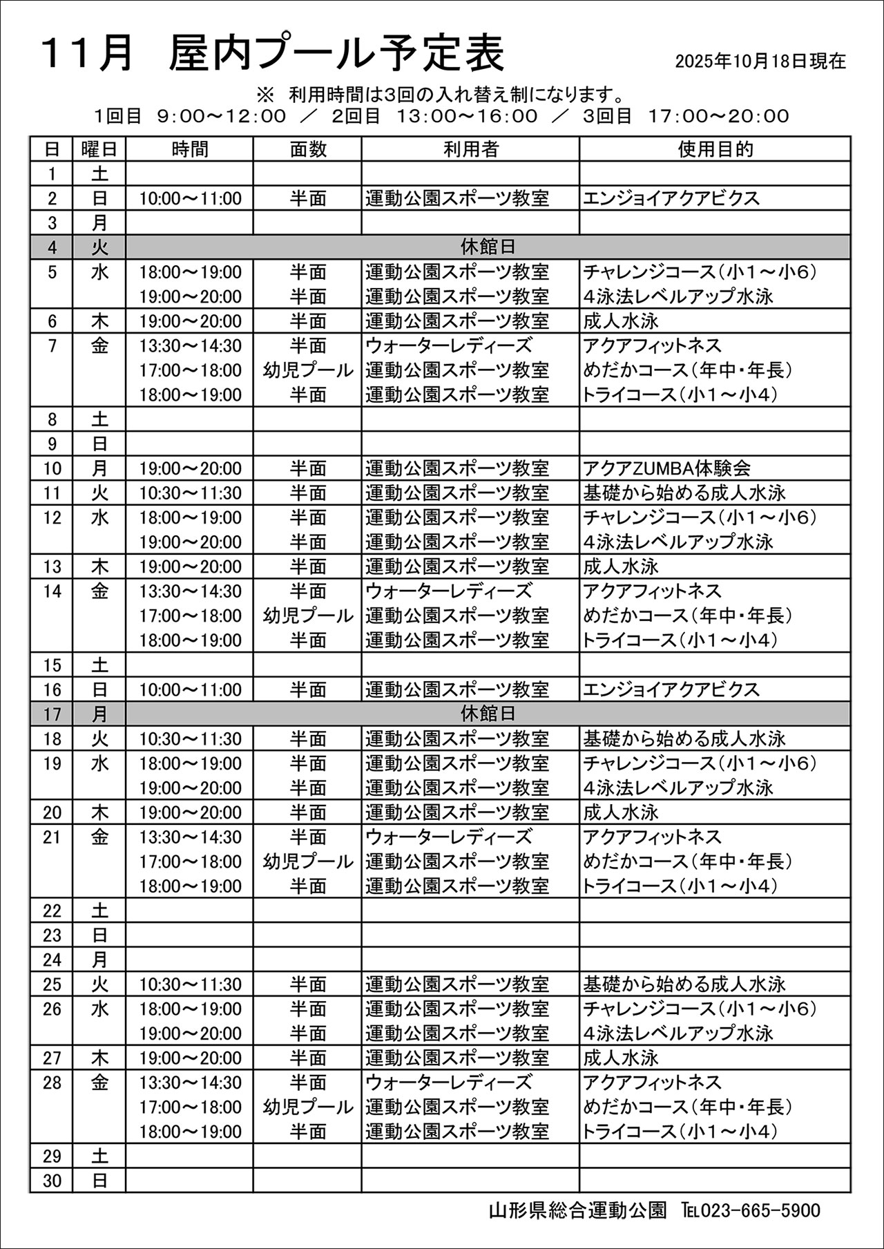 ◎2025年度 11月屋内プール予定表(PDFファイル)