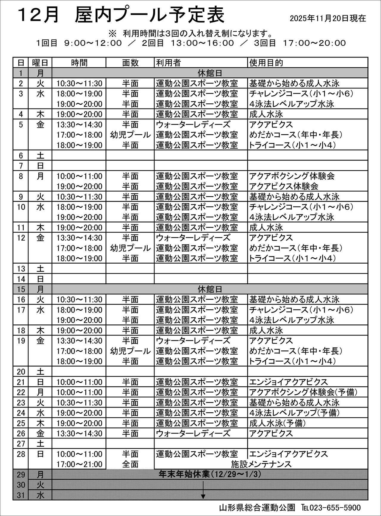 ◎2025年度 12月屋内プール予定表(PDFファイル)