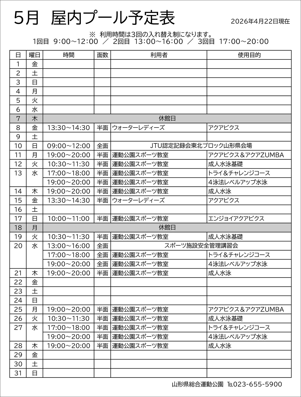 お知らせ News TOP お知らせ 2026年 4月 総合運動公園 5月屋内プール予定表 2026年4月28日(火) 総合運動公園 2026年5月の屋内プールの大会・教室・メンテナンスなどの予定については、下記のPDFをご確認ください。◎2026年度 5月屋内プール予定表(PDFファイル) 新しい記事一覧古い記事