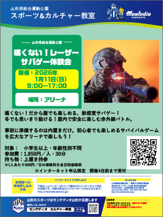 総合運動公園1月11日に開催する総合運動公園「痛くない!レーザーサバゲー体験会」の参加者募集のお知らせを掲載いたしました。
